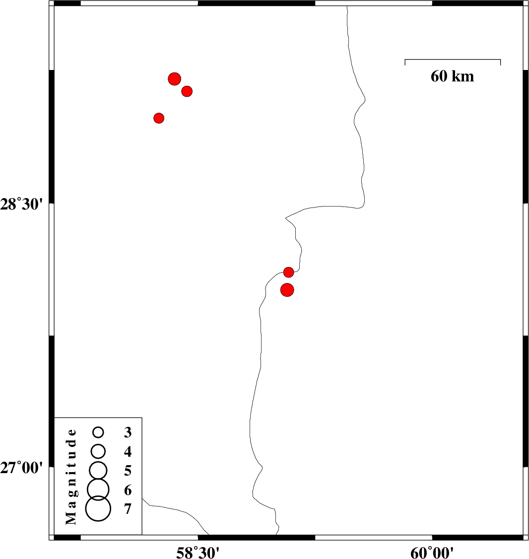 | 2010/06/23 | 15:20:24.3 | 19:50:24.3 | 28.01 | 59.07 | 15 | ML3.8 | Sistan va Baloochestan Province, 136 km East of Kahnuj | ||