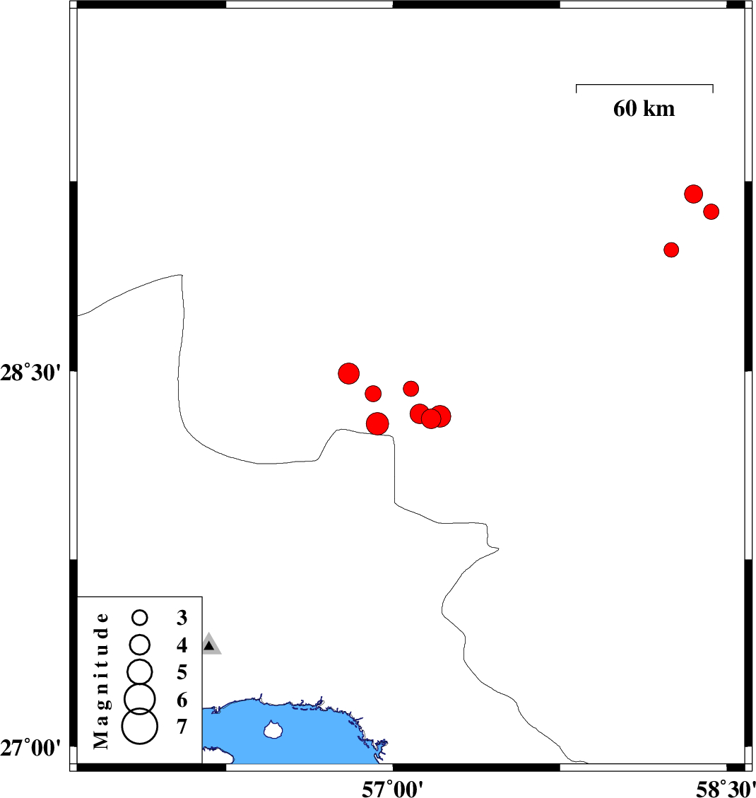 | 2010/06/14 | 04:13:45.8 | 08:43:45.8 | 28.33 | 57.12 | 15 | ML4 | Kerman Province, 70 km North-West of Kahnuj | ||