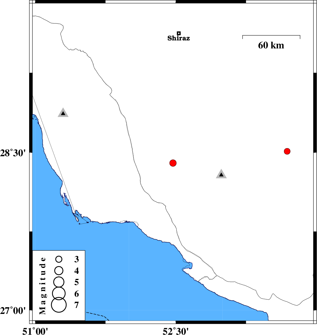 | 2010/06/21 | 23:46:46.1 | 04:16:46.1 | 28.51 | 53.69 | 28 | ML3 | Fars Province, 13 km East of Jahrom |