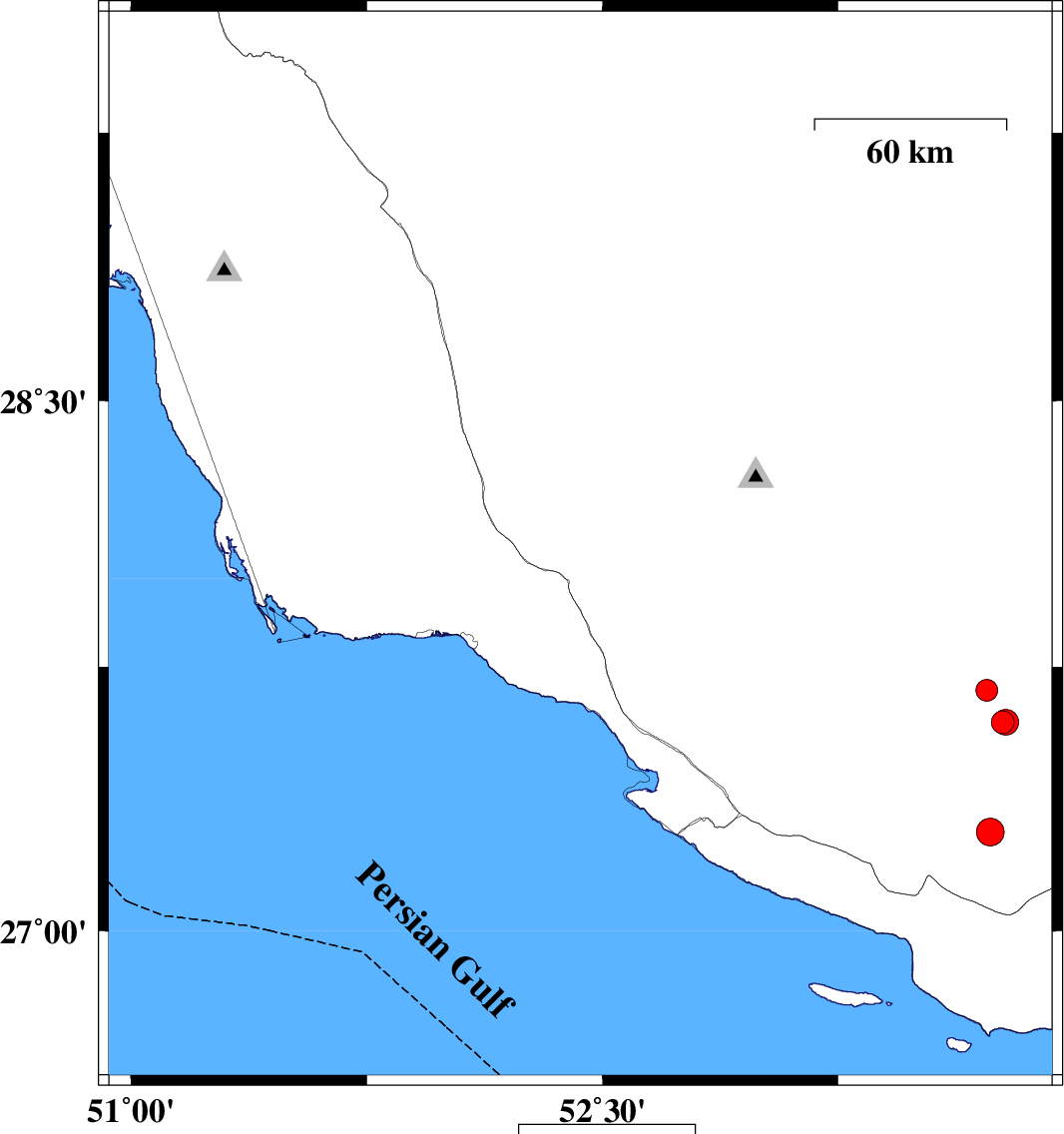 | 2010/06/27 | 18:38:57.4 | 23:08:57.4 | 28.4 | 52.47 | 2 | ML3.2 | Fars Province, 48 km South-West of Firuz Abad | ||