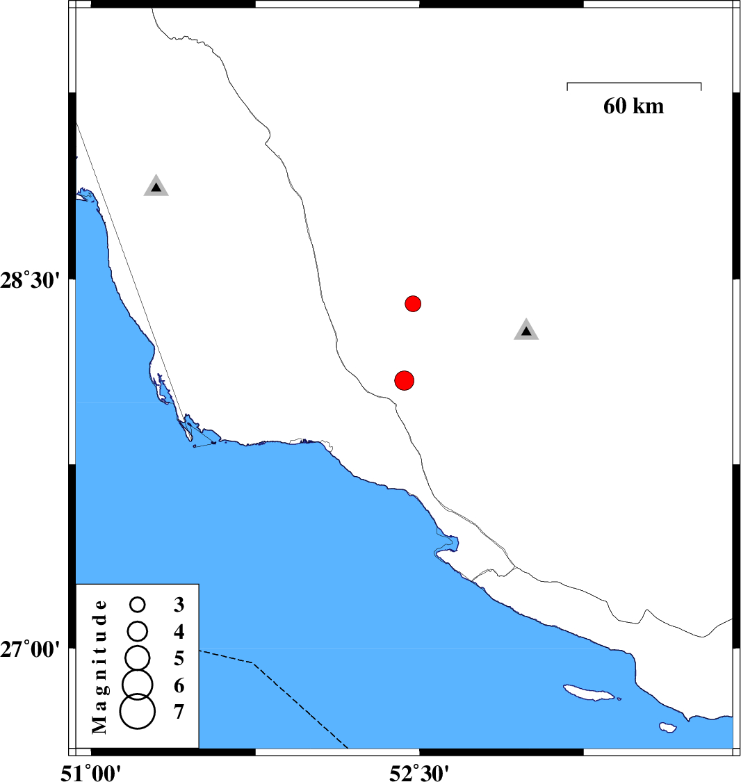 | 2010/06/27 | 18:38:57.4 | 23:08:57.4 | 28.4 | 52.47 | 2 | ML3.2 | Fars Province, 48 km South-West of Firuz Abad |