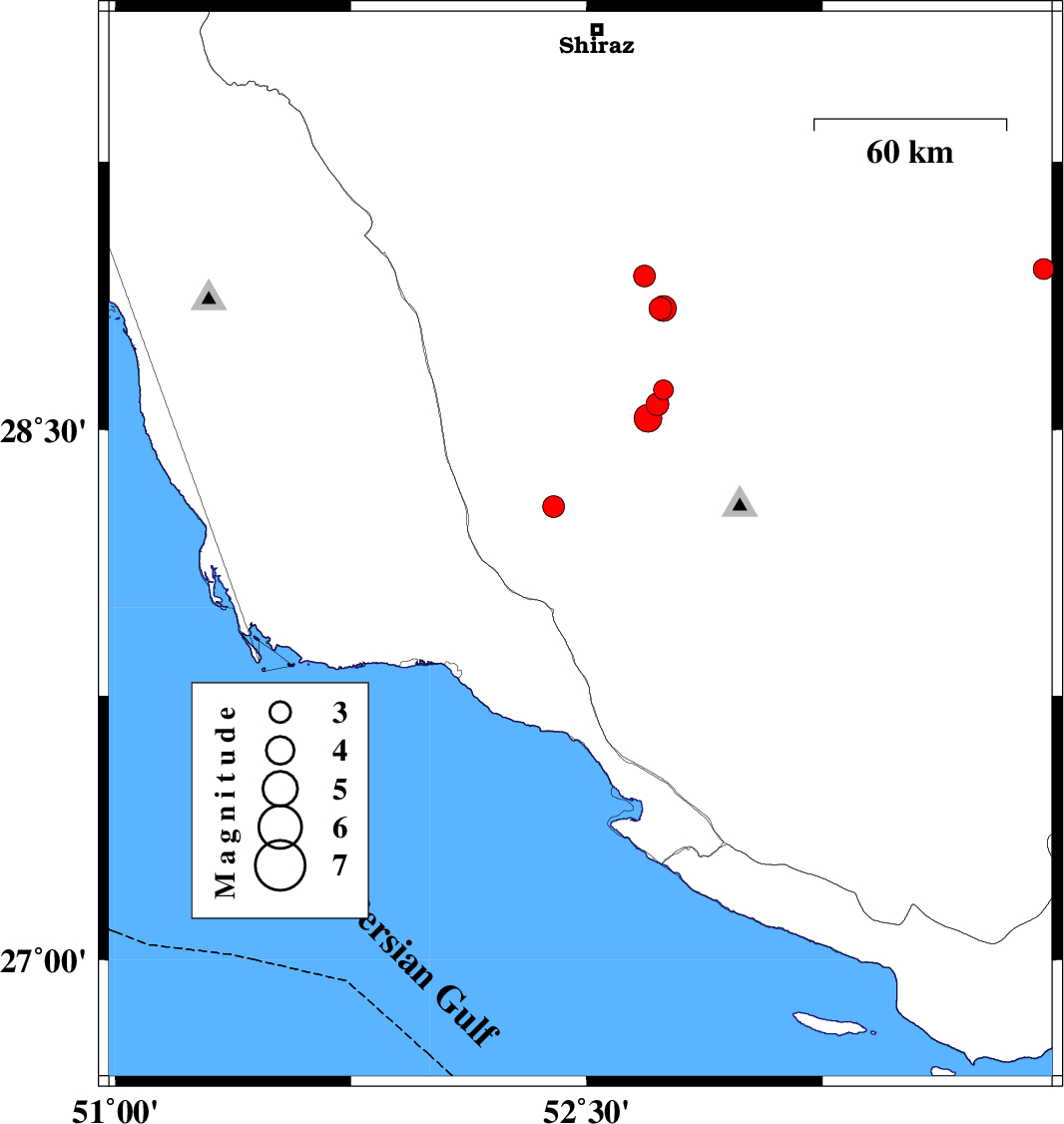 | 2010/06/08 | 10:21:08.4 | 14:51:08.4 | 29.61 | 51.31 | 15 | ML3.3 | Fars Province, 34 km West of Kazerun | ||