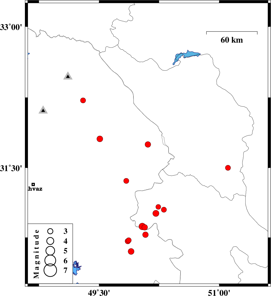 | 2010/06/07 | 02:28:10.2 | 06:58:10.2 | 30.87 | 50.04 | 26 | ML3.8 | Kohkiluieh va boyerahmad Province, 34 km North-East of Omidiyeh | ||
