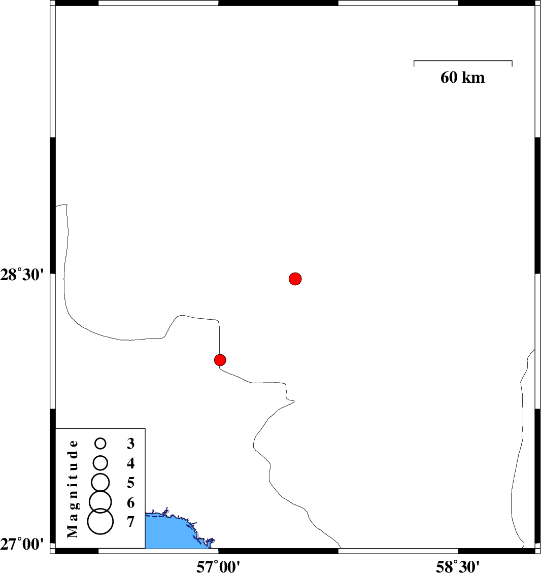 | 2010/07/08 | 10:29:41.8 | 14:59:41.8 | 28.02 | 57.01 | 14 | ML3.2 | Kerman Province, 68 km West of Kahnuj |