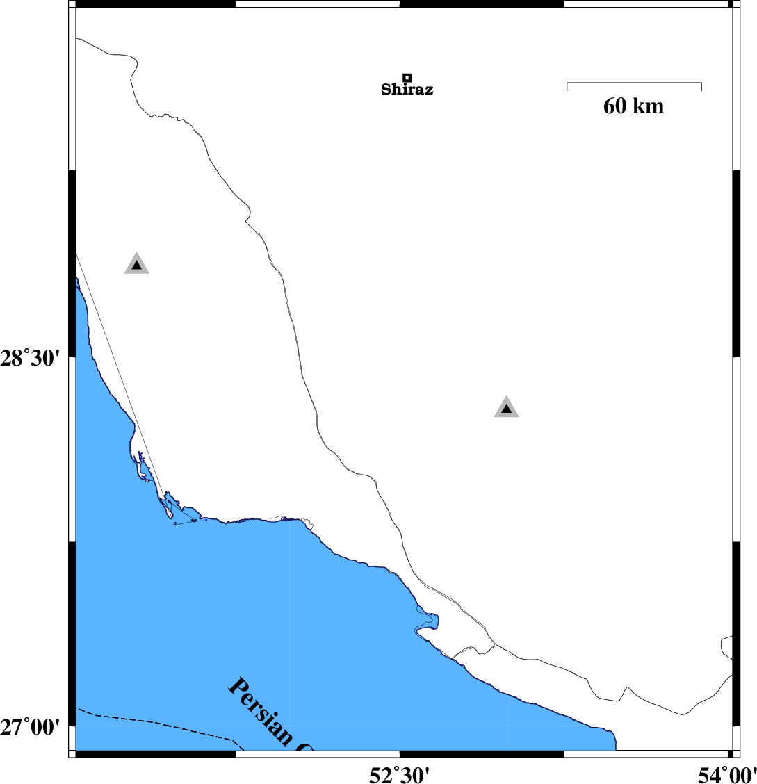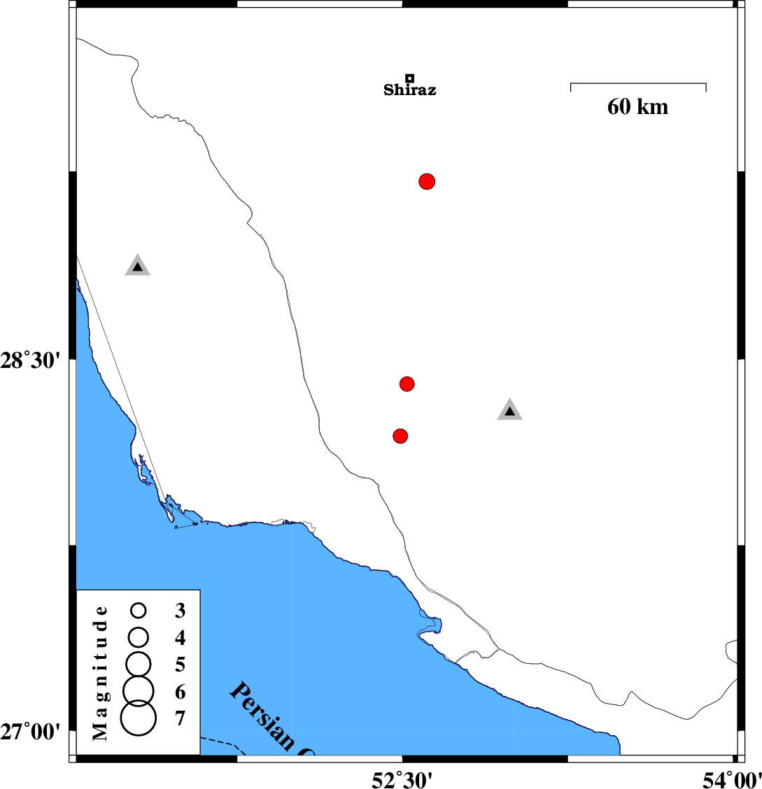 | 2010/07/12 | 11:52:48.7 | 16:22:48.7 | 28.4 | 52.52 | 15 | ML2.9 | Fars Province, 48 km South of Firuz Abad | ||