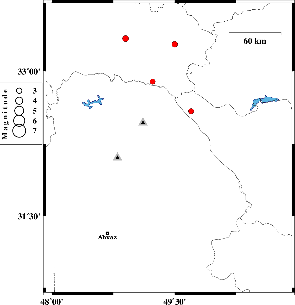 | 2010/06/26 | 08:37:20.5 | 13:07:20.5 | 32.46 | 48.47 | 14 | ML2.6 | Khoozestan Province, 11 km East of Andimeshk | ||