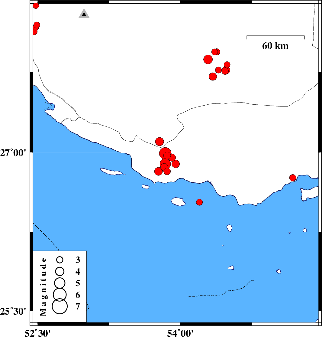 | 2010/07/20 | 20:01:28.4 | 00:31:28.4 | 27.1 | 53.78 | 39 | ML3.9 | Fars Province, 59 km West of Bastak | ||