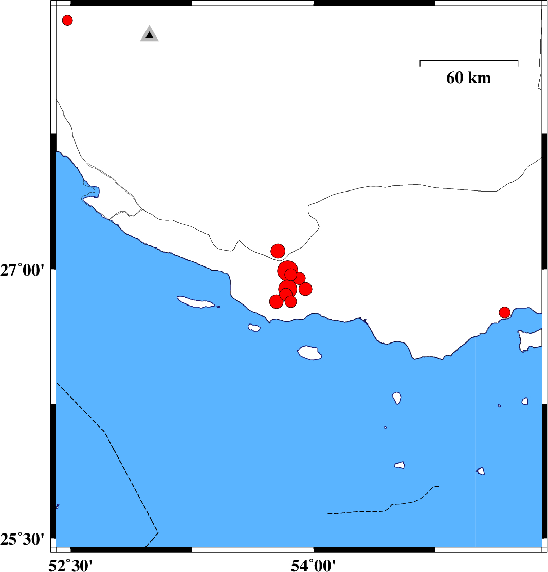 2010/07/20 20:24:52.4 00:54:52.4 26.8953.9518 ML3.7 Hormozgan Province, 53 km South-West of Bastak
