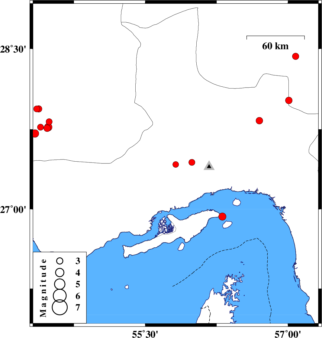 | 2010/06/30 | 04:13:59.7 | 08:43:59.7 | 27.83 | 56.7 | 14 | ML3.3 | Hormozgan Province, 70 km North-West of Dehbarez | ||