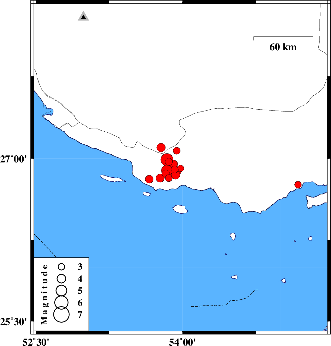 | 2010/07/20 | 20:01:28.4 | 00:31:28.4 | 27.1 | 53.78 | 39 | ML3.9 | Fars Province, 59 km West of Bastak | ||