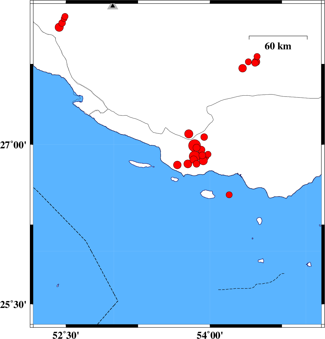 | 2010/07/20 | 20:01:28.4 | 00:31:28.4 | 27.1 | 53.78 | 39 | ML3.9 | Fars Province, 59 km West of Bastak | ||