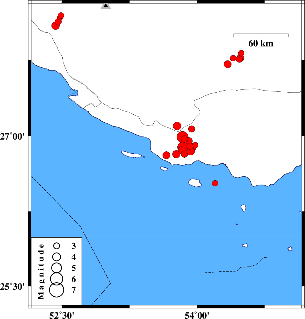 | 2010/06/24 | 10:16:50.3 | 14:46:50.3 | 26.53 | 54.2 | 18 | ML3 | Persian Gulf, 65 km West of Bandar-e lengeh | ||