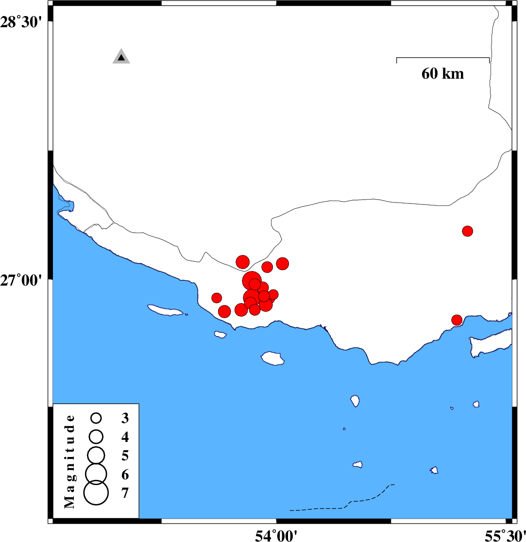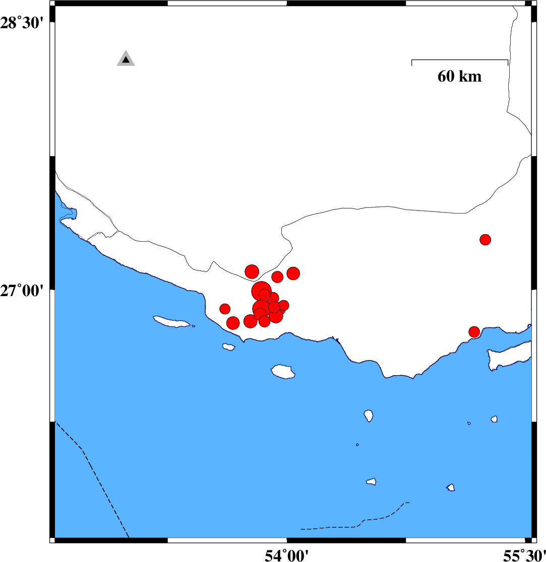 | 2010/07/20 | 20:01:28.4 | 00:31:28.4 | 27.1 | 53.78 | 39 | ML3.9 | Fars Province, 59 km West of Bastak | ||