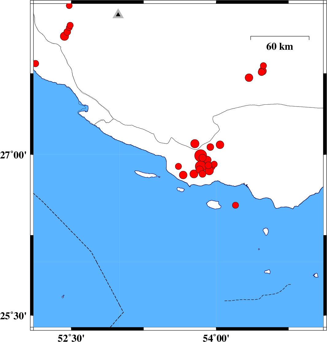 | 2010/07/20 | 20:01:28.4 | 00:31:28.4 | 27.1 | 53.78 | 39 | ML3.9 | Fars Province, 59 km West of Bastak | ||