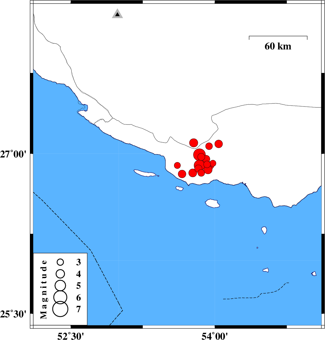 | 2010/07/20 | 20:01:28.4 | 00:31:28.4 | 27.1 | 53.78 | 39 | ML3.9 | Fars Province, 59 km West of Bastak | ||