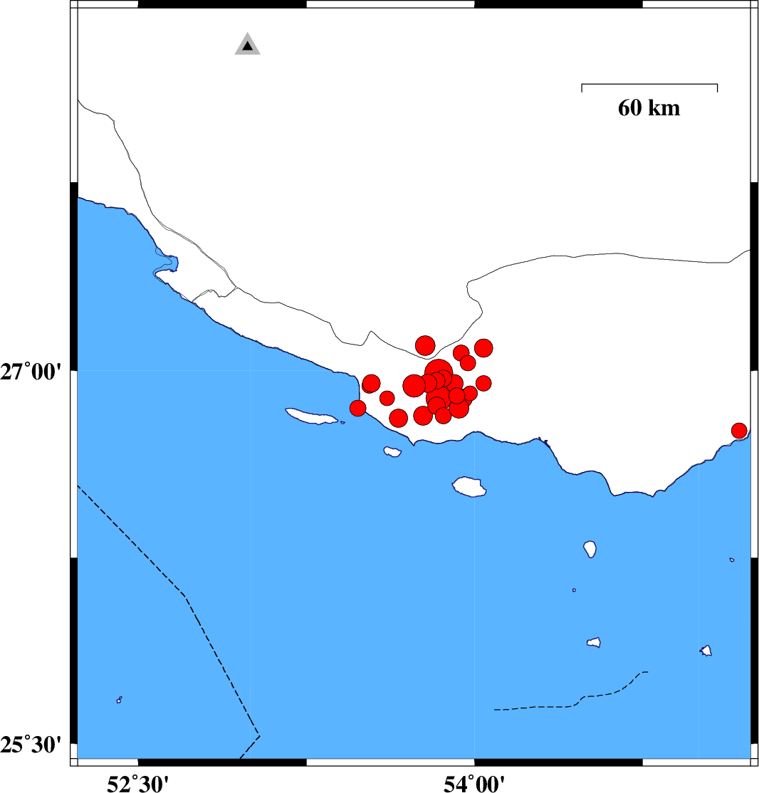 | 2010/07/20 | 20:01:28.4 | 00:31:28.4 | 27.1 | 53.78 | 39 | ML3.9 | Fars Province, 59 km West of Bastak | ||