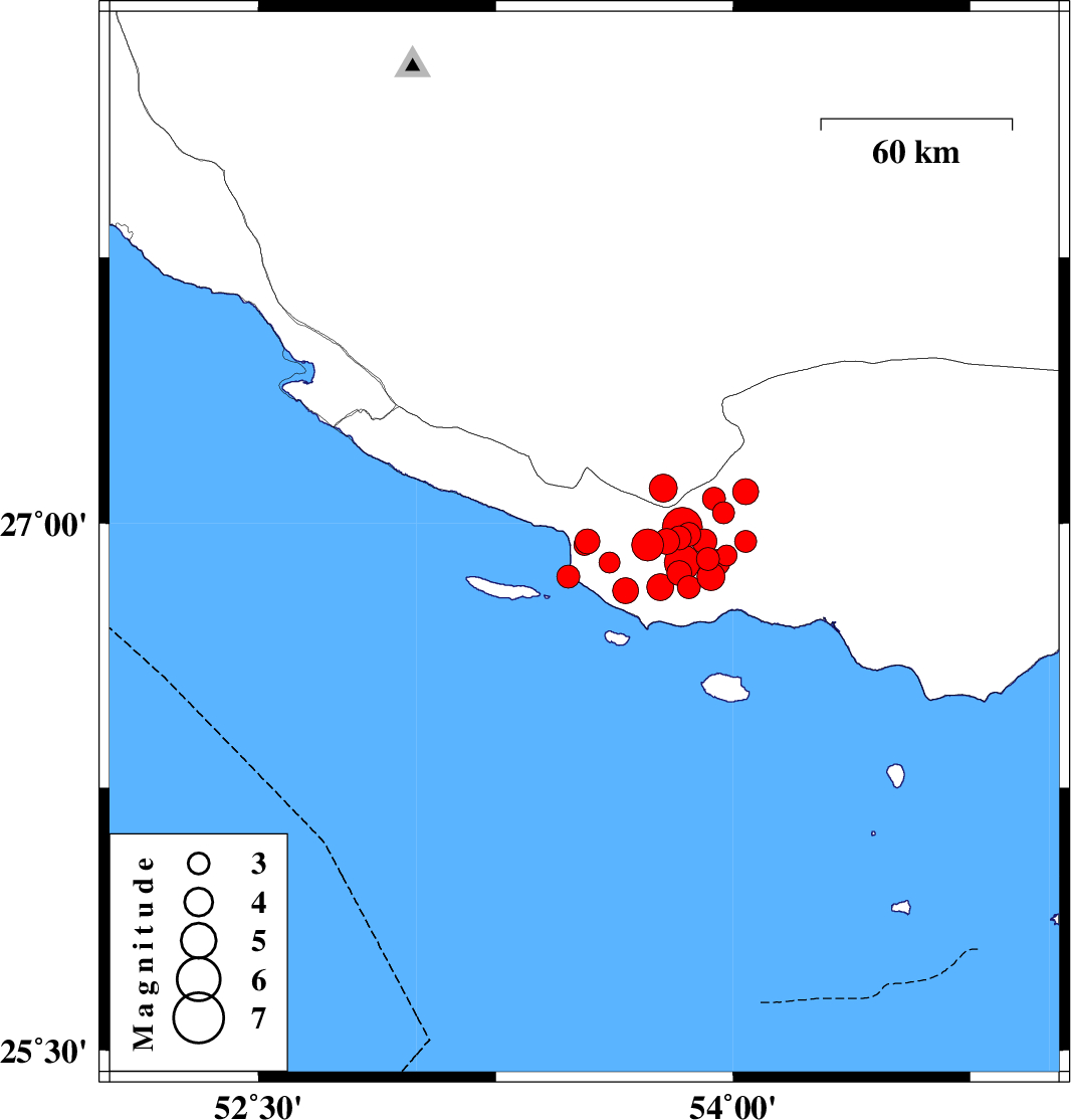 | 2010/07/24 | 13:07:38.1 | 17:37:38.1 | 26.85 | 53.48 | 14 | ML3.2 | Persian Gulf, 62 km South-East of Lamerd | ||