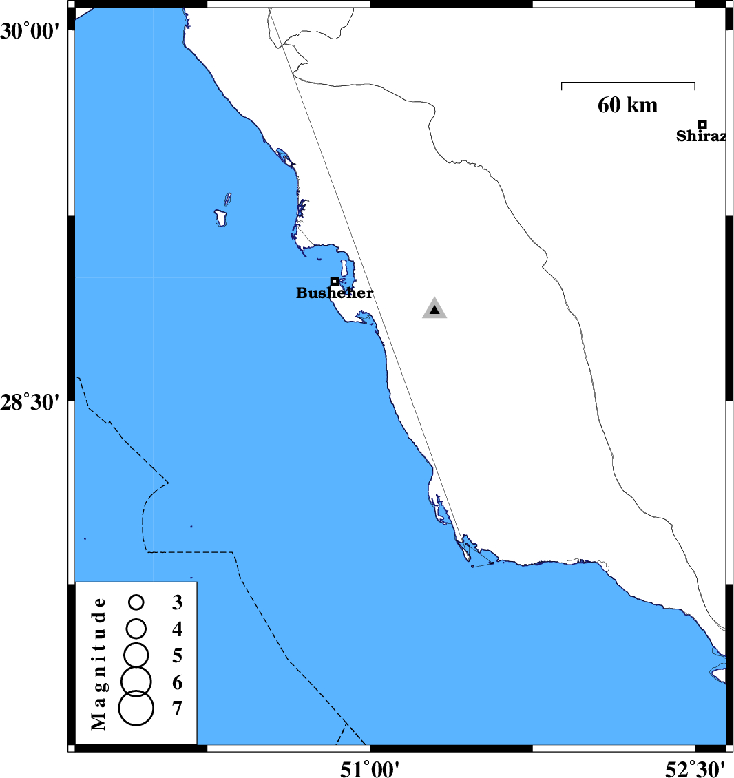 | 2010/07/25 | 20:52:08.6 | 01:22:08.6 | 28.59 | 51.14 | 20 | ML3.4 | Bushehr Province, 24 km West of Khormog |