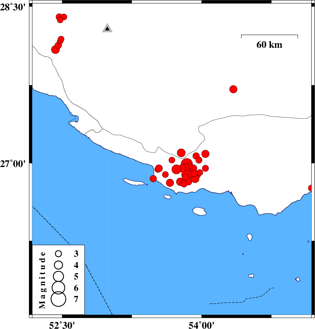 | 2010/07/24 | 13:07:38.1 | 17:37:38.1 | 26.85 | 53.48 | 14 | ML3.2 | Persian Gulf, 62 km South-East of Lamerd | ||