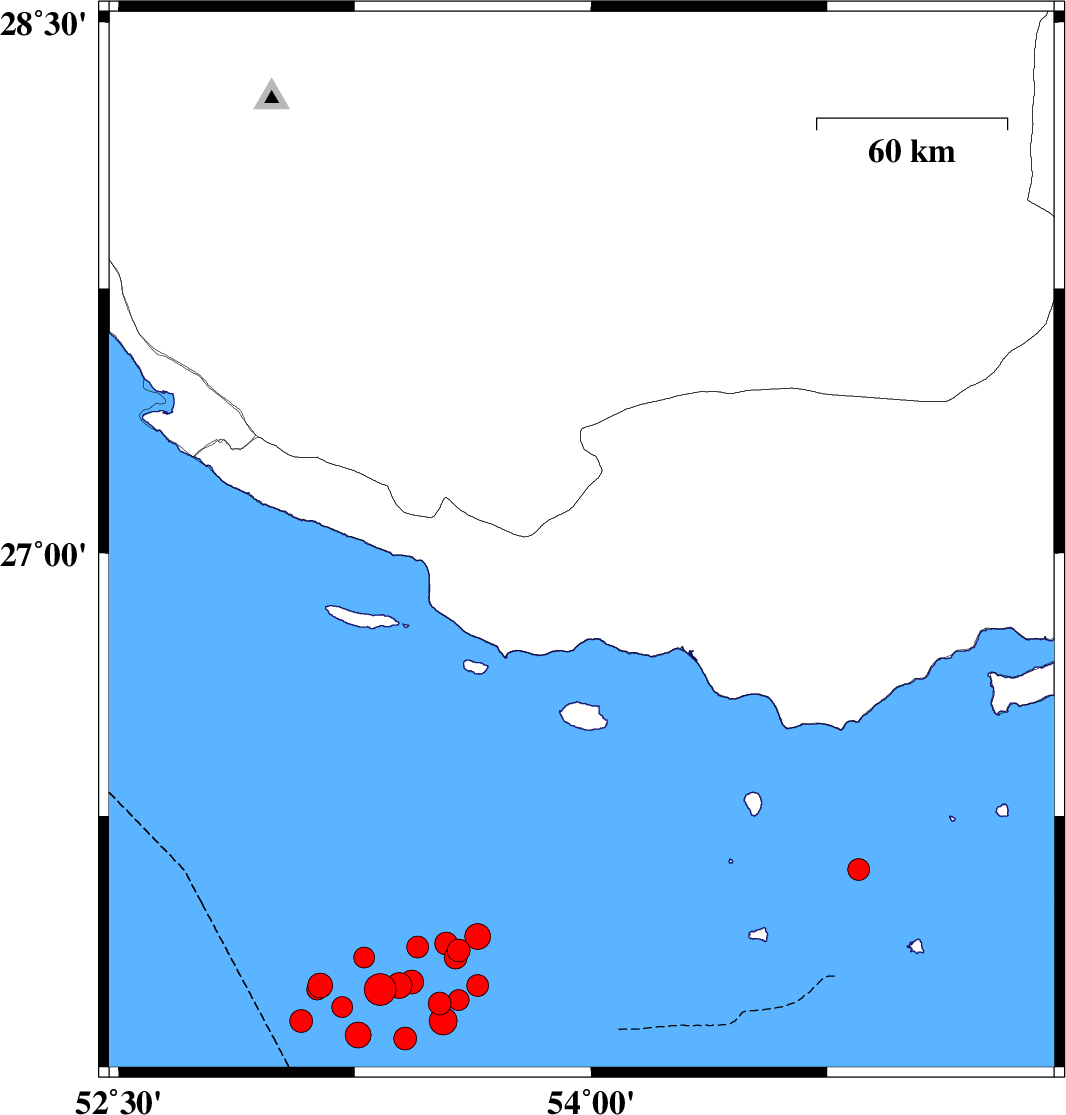 | 2010/07/24 | 13:07:38.1 | 17:37:38.1 | 26.85 | 53.48 | 14 | ML3.2 | Persian Gulf, 62 km South-East of Lamerd | ||