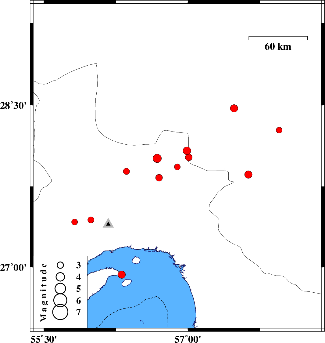 | 2010/06/30 | 04:13:59.7 | 08:43:59.7 | 27.83 | 56.7 | 14 | ML3.3 | Hormozgan Province, 70 km North-West of Dehbarez |