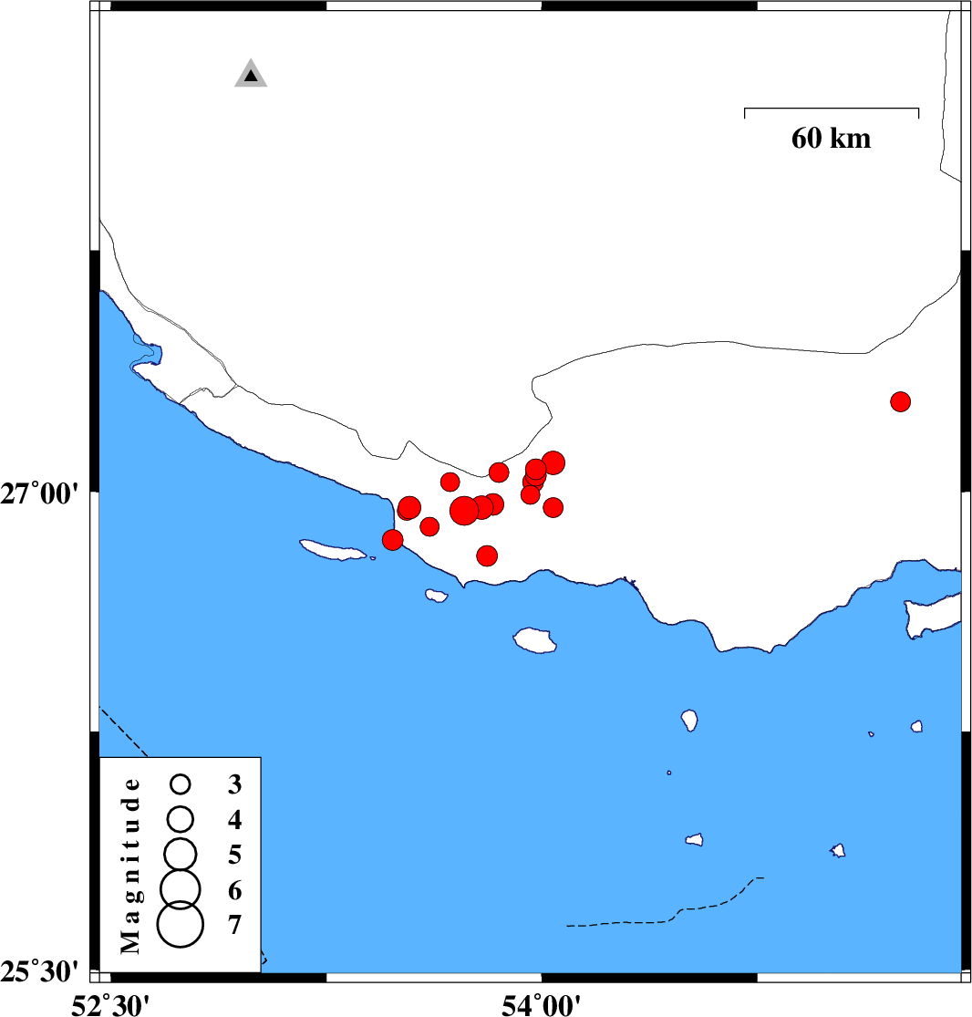2010/07/29 16:02:26.6 20:32:26.6 26.9953.9615 ML3 Hormozgan Province, 46 km South-West of Bastak