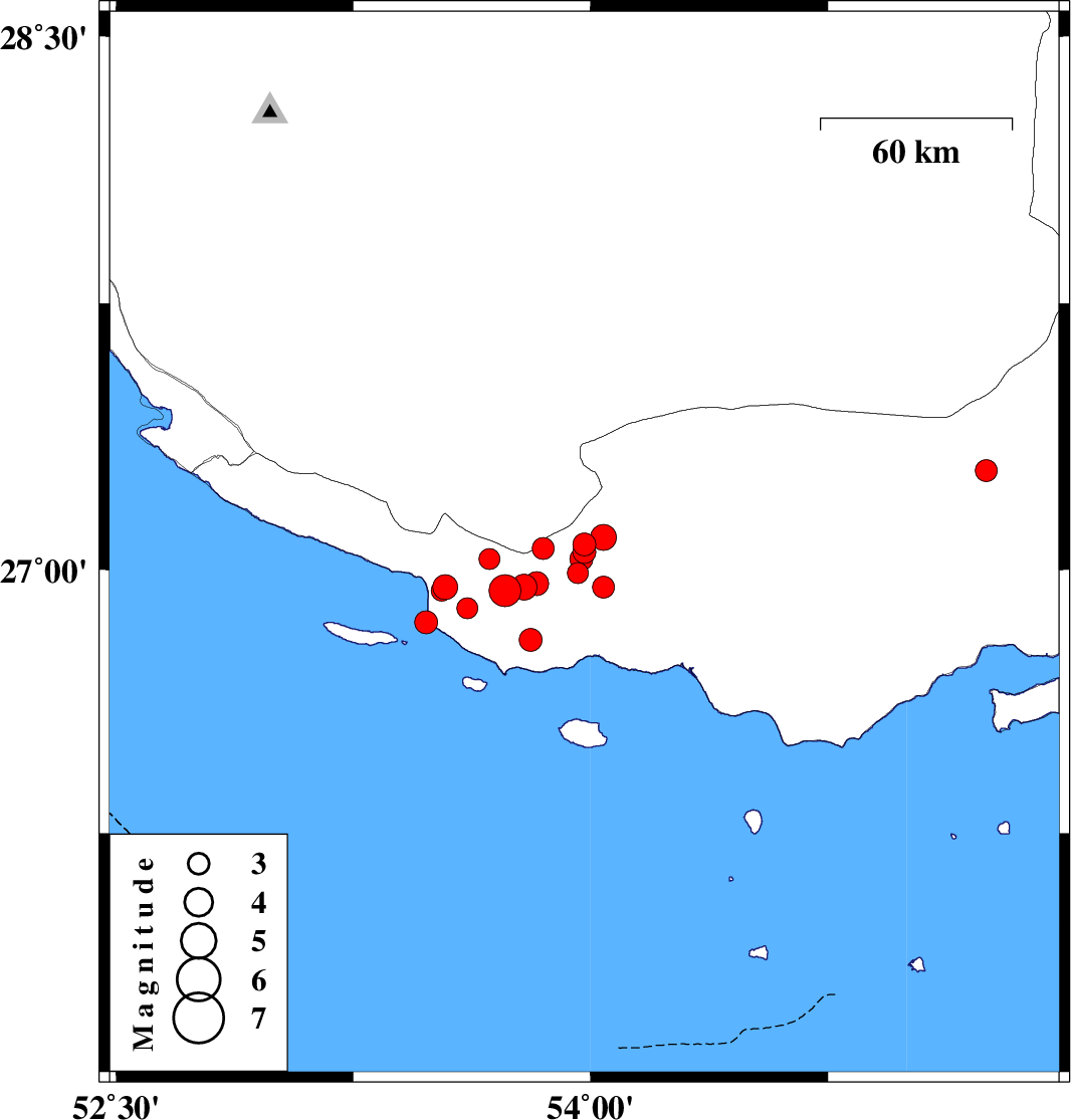 | 2010/07/22 | 03:18:19.2 | 07:48:19.2 | 27.09 | 54.04 | 14 | ML3.6 | Hormozgan Province, 35 km South-West of Bastak |
