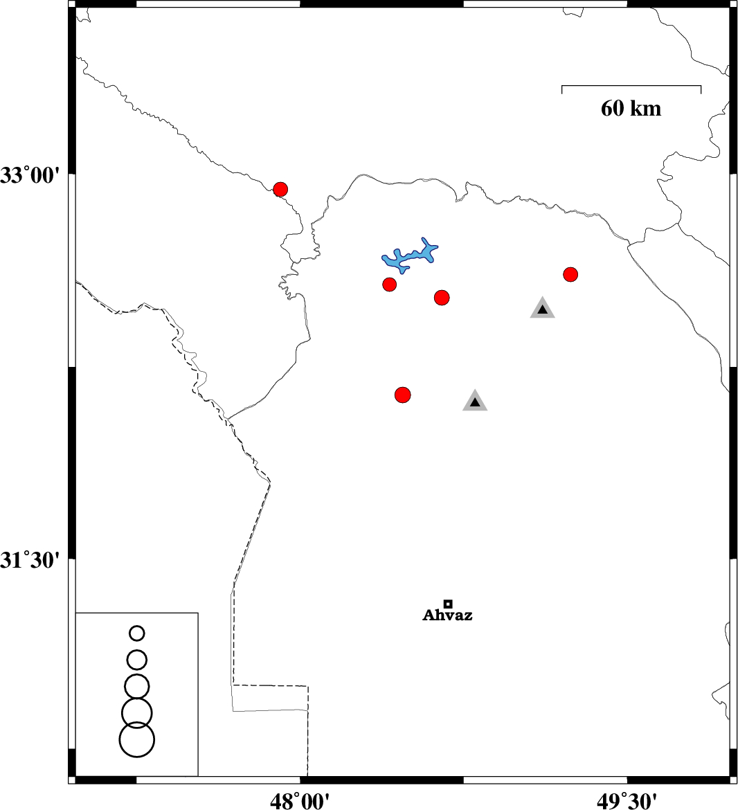 | 2010/07/28 | 11:17:06.2 | 15:47:06.2 | 32.57 | 48.41 | 18 | ML2.8 | Khoozestan Province, 13 km North of Andimeshk | ||
