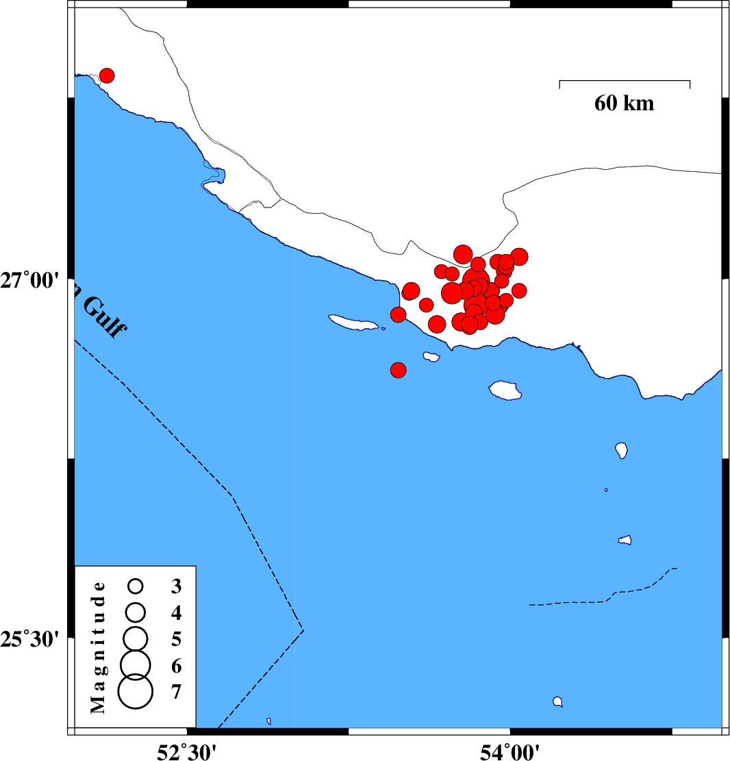 | 2010/07/24 | 13:07:38.1 | 17:37:38.1 | 26.85 | 53.48 | 14 | ML3.2 | Persian Gulf, 62 km South-East of Lamerd | ||