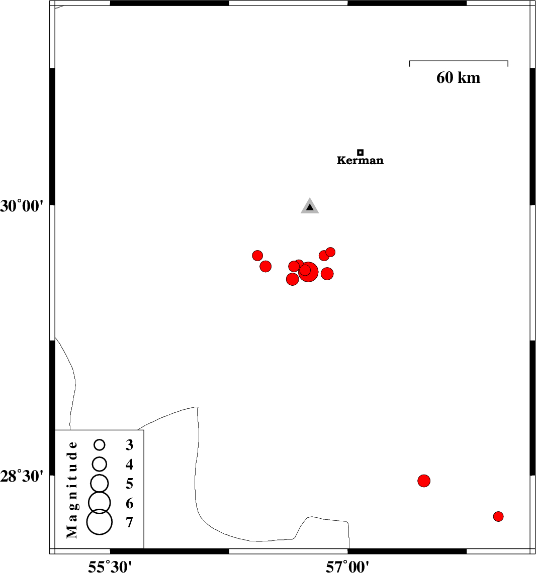 | 2010/07/31 | 13:18:47.1 | 17:48:47.1 | 29.66 | 56.48 | 18 | ML3.2 | Kerman Province, 30 km South of Bardsir | ||