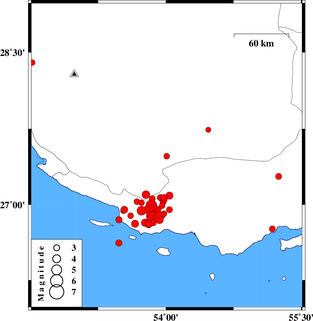 | 2010/07/20 | 20:01:28.4 | 00:31:28.4 | 27.1 | 53.78 | 39 | ML3.9 | Fars Province, 59 km West of Bastak | ||