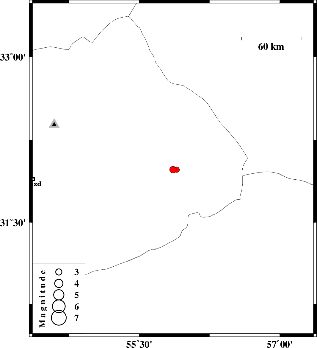 | 2010/08/04 | 18:15:43.2 | 22:45:43.2 | 31.98 | 55.86 | 14 | ML3.3 | Yazd Province, 60 km North-East of Bafq | ||