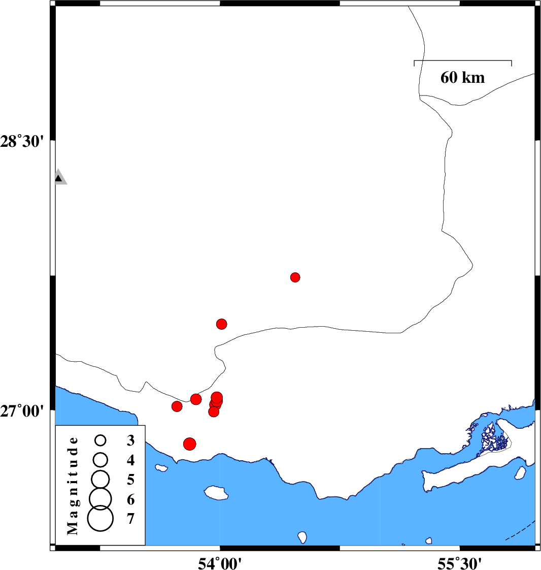 | 2010/07/28 | 08:21:37.5 | 12:51:37.5 | 27.03 | 53.97 | 14 | ML3.3 | Hormozgan Province, 43 km South-West of Bastak |