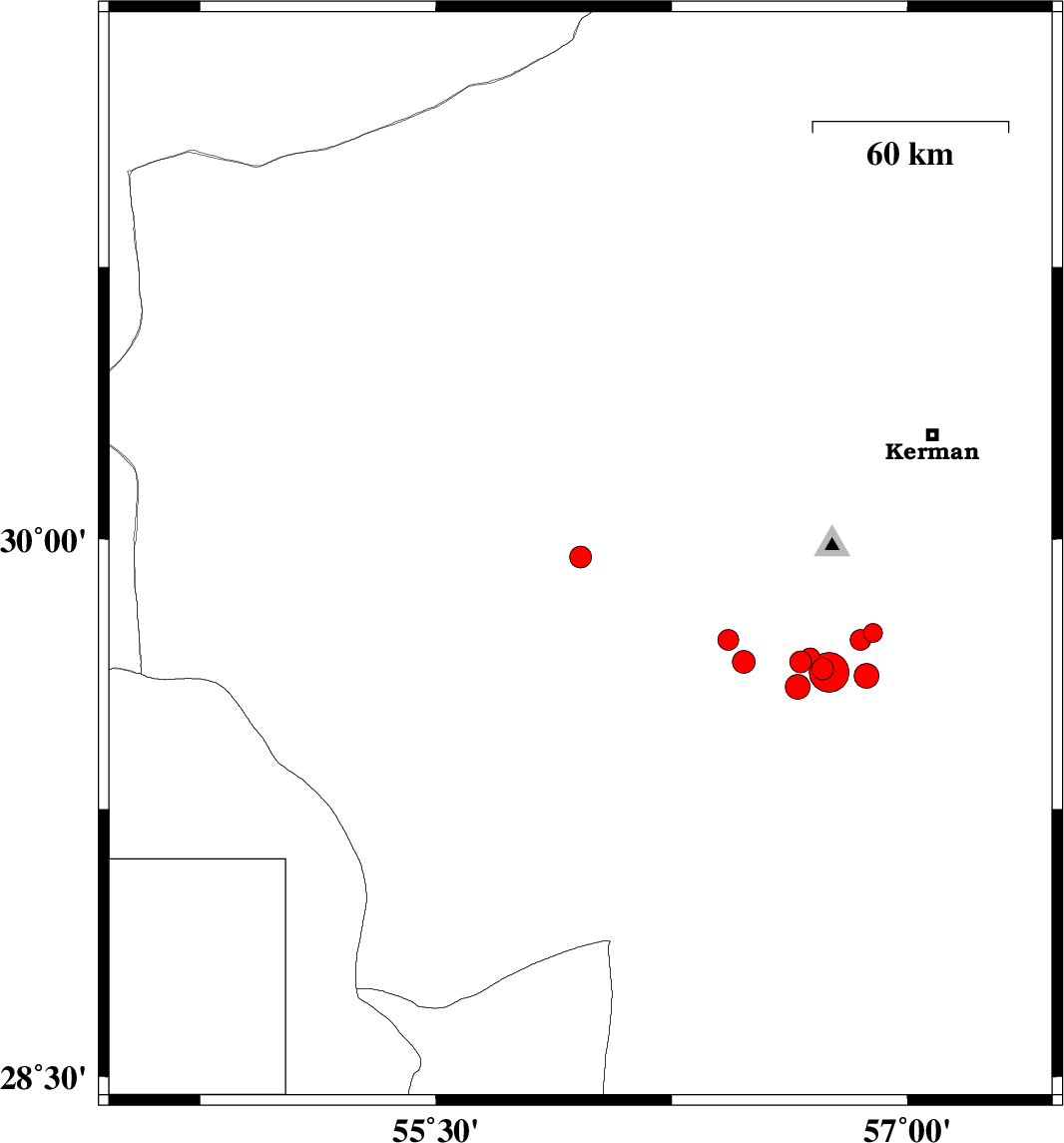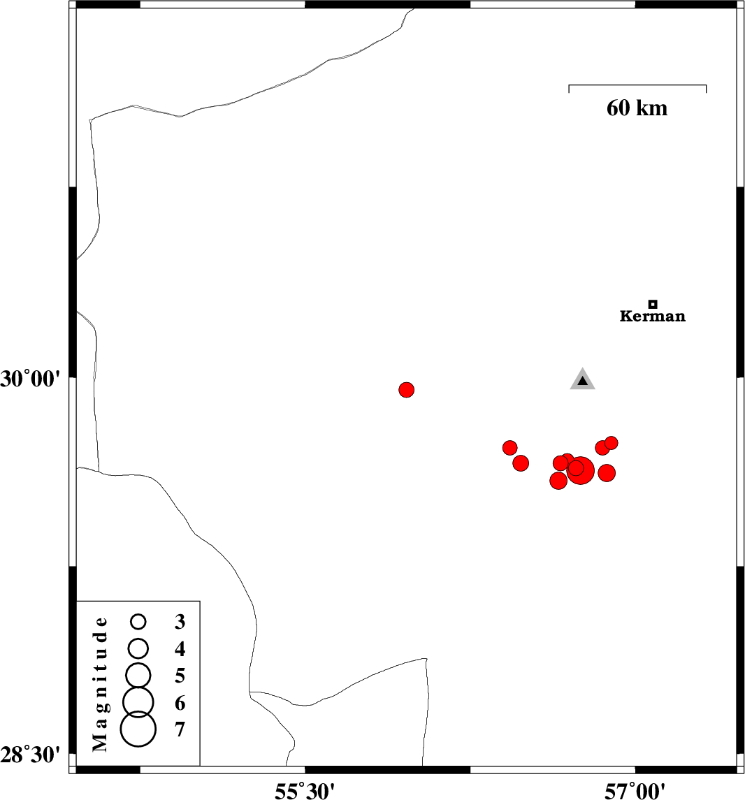 | 2010/07/31 | 09:34:19.3 | 14:04:19.3 | 29.72 | 56.43 | 15 | ML3 | Kerman Province, 26 km South-West of Bardsir | ||