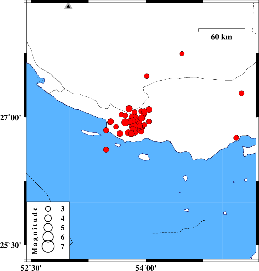 | 2010/07/23 | 08:39:14.4 | 13:09:14.4 | 26.96 | 53.83 | 14 | ML3.4 | Hormozgan Province, 59 km South-West of Bastak | ||