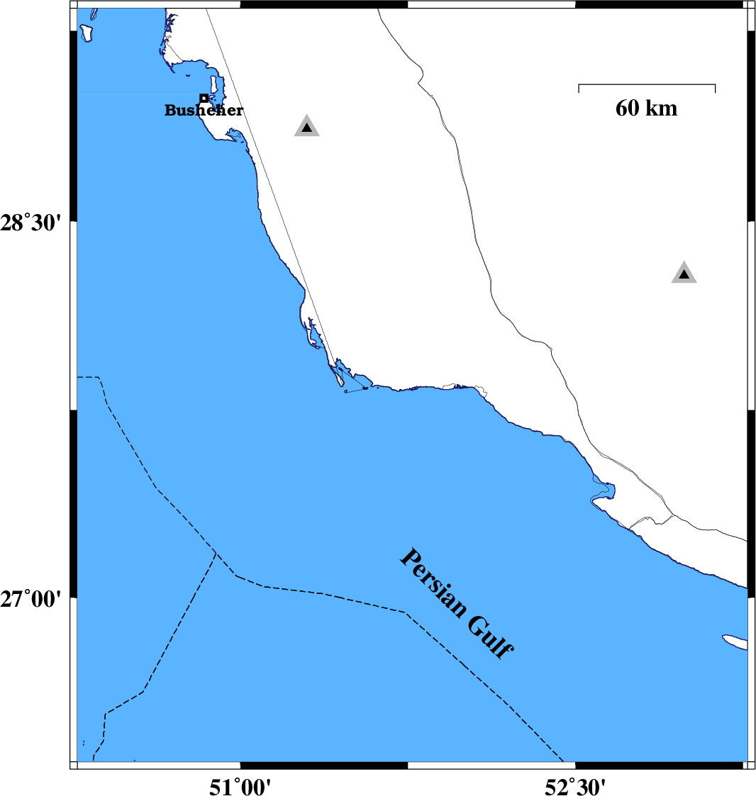 | 2010/08/06 | 19:24:56.5 | 23:54:56.5 | 29.3 | 51.02 | 34 | ML3 | Bushehr Province, 18 km West of Borazjan | ||
