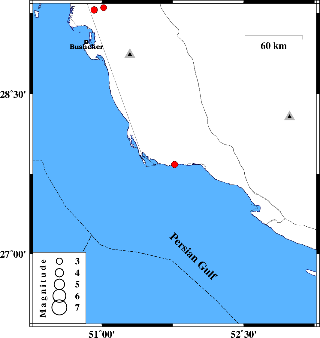 | 2010/08/06 | 19:24:56.5 | 23:54:56.5 | 29.3 | 51.02 | 34 | ML3 | Bushehr Province, 18 km West of Borazjan | ||