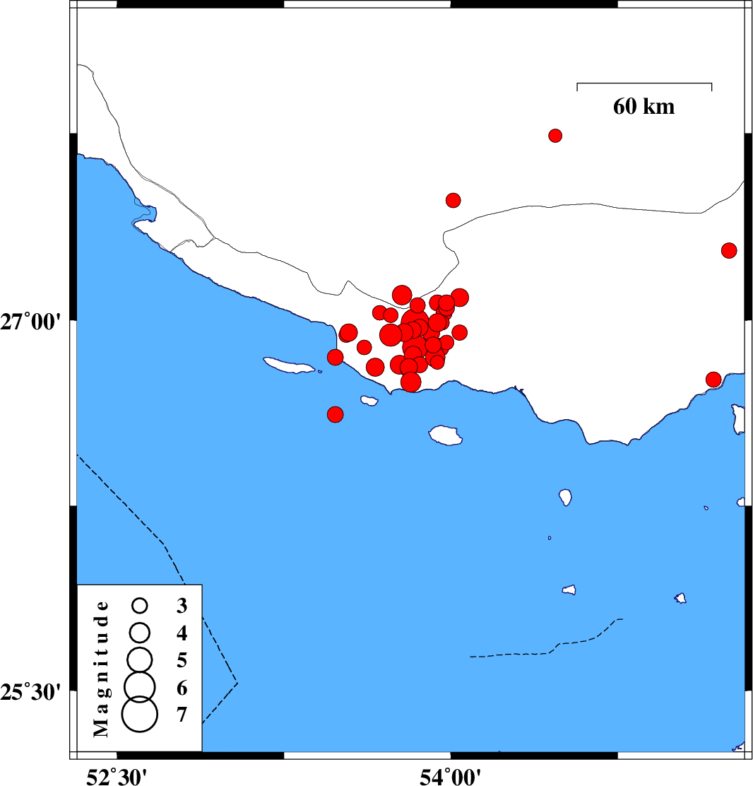 | 2010/07/20 | 20:01:28.4 | 00:31:28.4 | 27.1 | 53.78 | 39 | ML3.9 | Fars Province, 59 km West of Bastak | ||