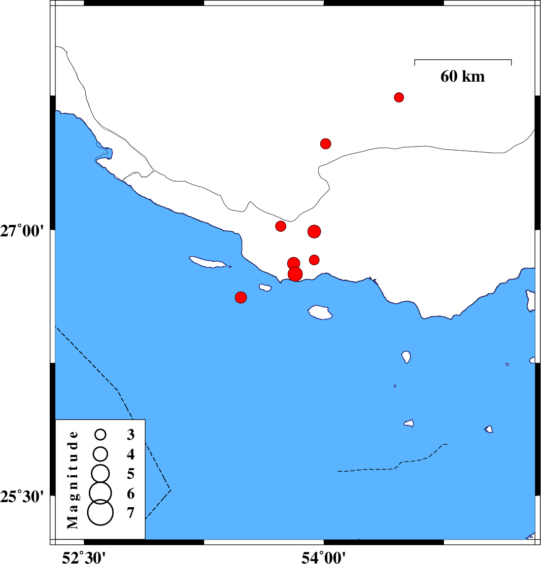 | 2010/08/01 | 15:33:19.3 | 20:03:19.3 | 26.81 | 53.81 | 15 | ML3.5 | Hormozgan Province, 70 km South-West of Bastak |