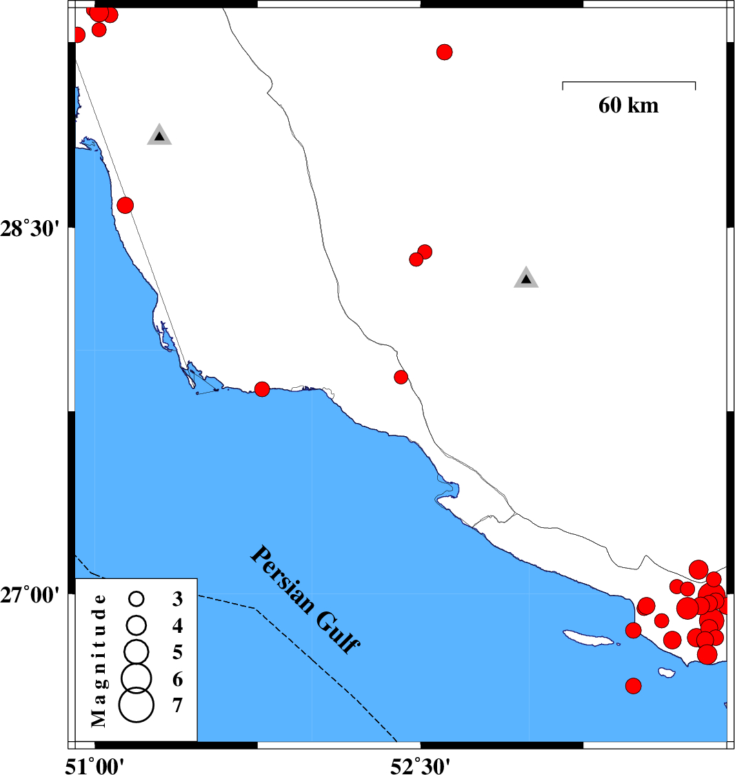 | 2010/08/06 | 19:24:56.5 | 23:54:56.5 | 29.3 | 51.02 | 34 | ML3 | Bushehr Province, 18 km West of Borazjan | ||