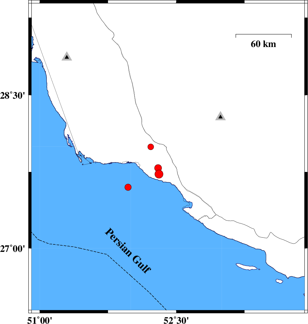 | 2010/08/06 | 19:24:56.5 | 23:54:56.5 | 29.3 | 51.02 | 34 | ML3 | Bushehr Province, 18 km West of Borazjan | ||