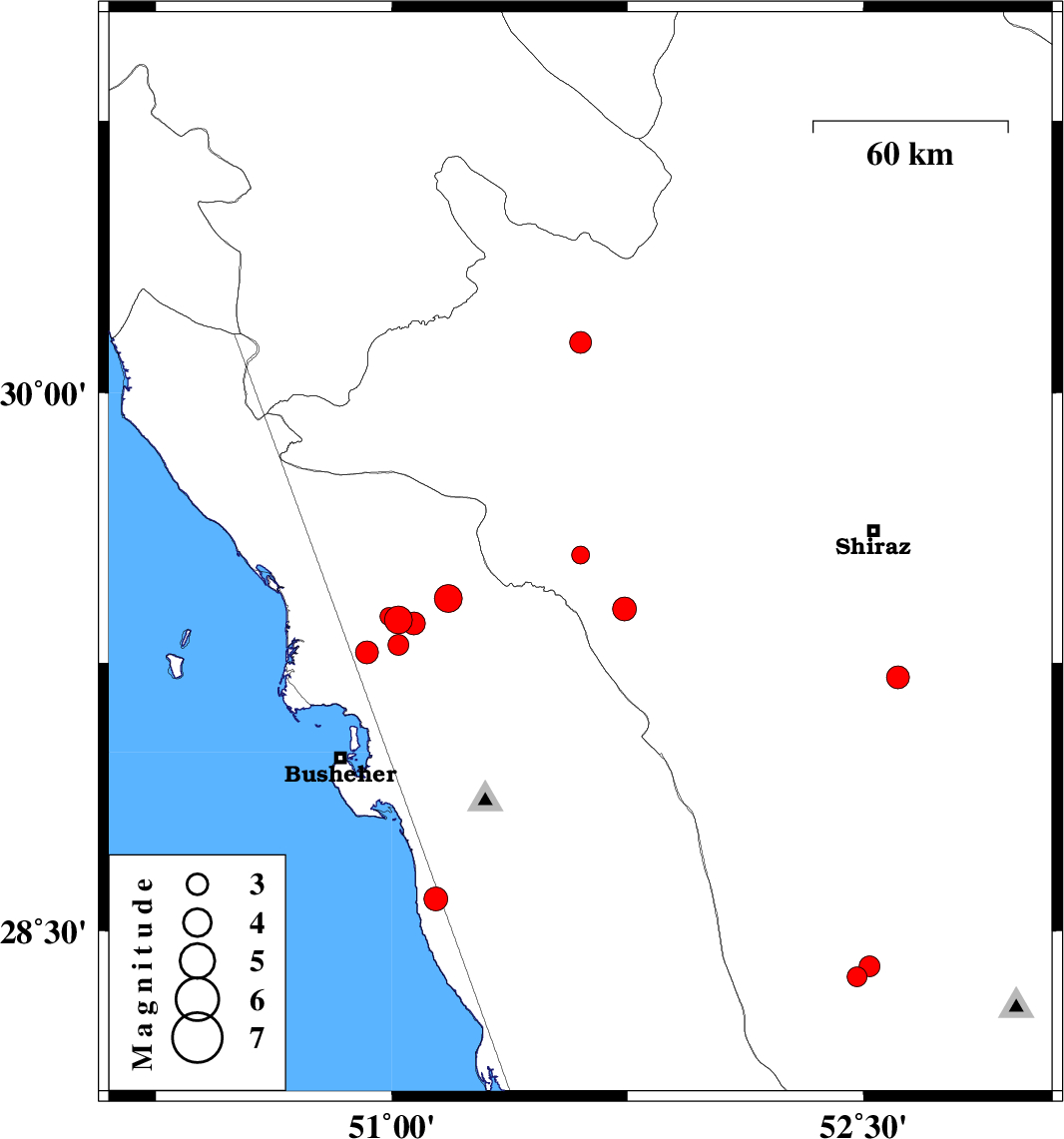 | 2010/08/06 | 19:24:56.5 | 23:54:56.5 | 29.3 | 51.02 | 34 | ML3 | Bushehr Province, 18 km West of Borazjan | ||