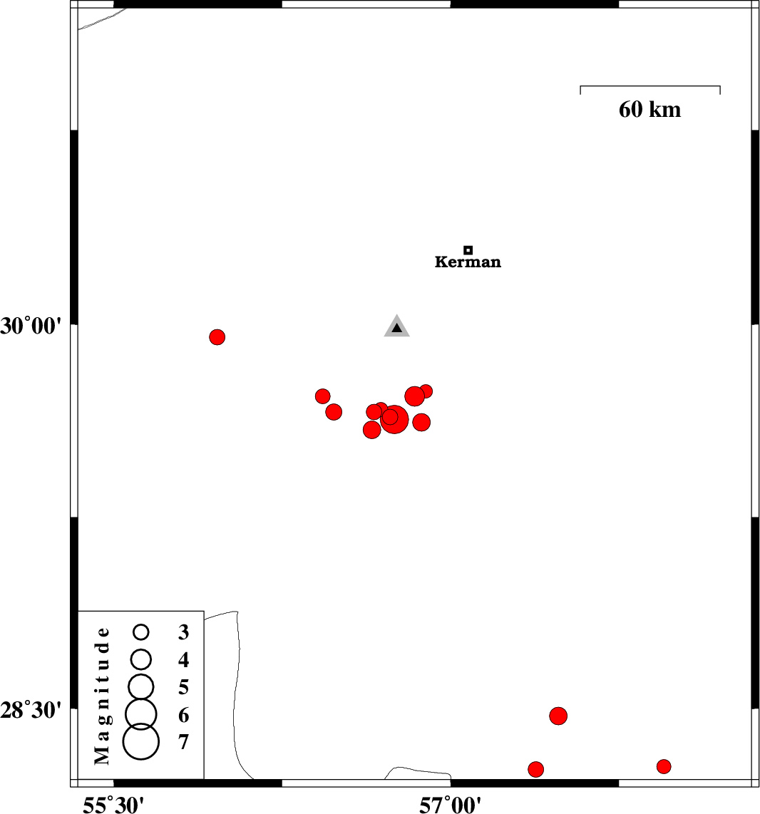 | 2010/07/31 | 09:34:19.3 | 14:04:19.3 | 29.72 | 56.43 | 15 | ML3 | Kerman Province, 26 km South-West of Bardsir | ||
