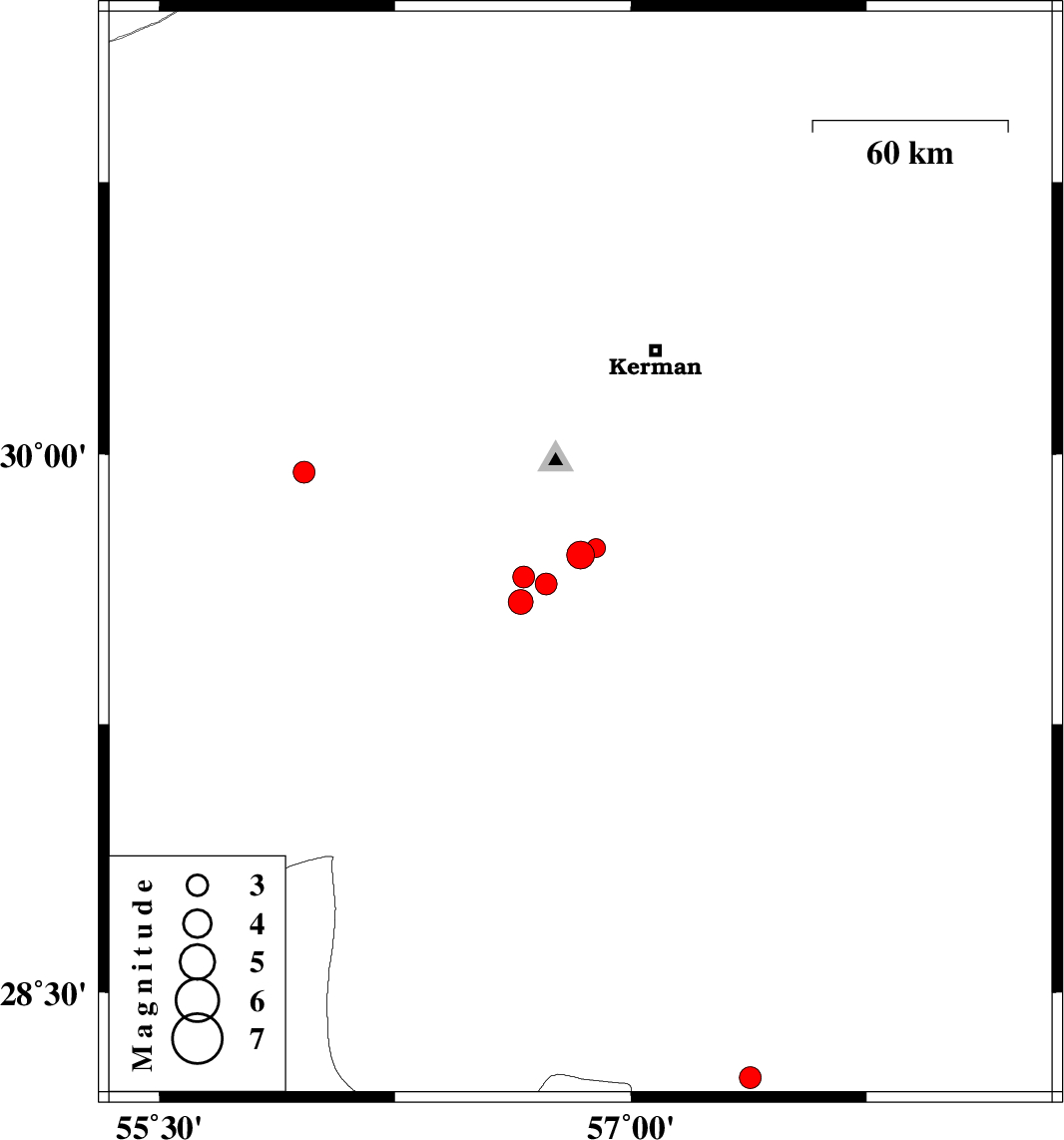 | 2010/08/03 | 06:34:15.3 | 11:04:15.3 | 29.66 | 56.66 | 14 | ML3.1 | Kerman Province, 30 km South of Bardsir | ||
