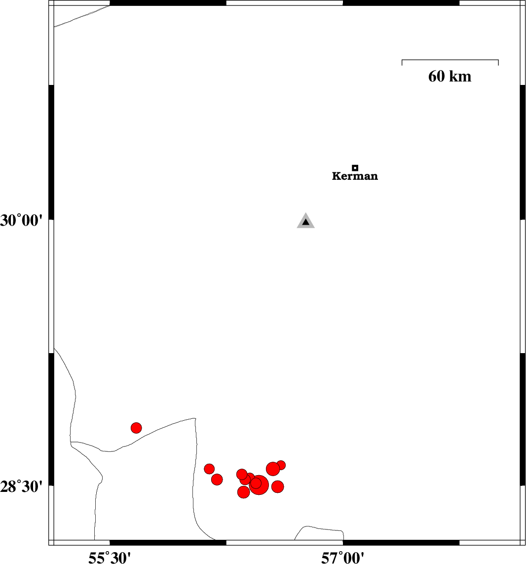 | 2010/07/31 | 09:34:19.3 | 14:04:19.3 | 29.72 | 56.43 | 15 | ML3 | Kerman Province, 26 km South-West of Bardsir | ||