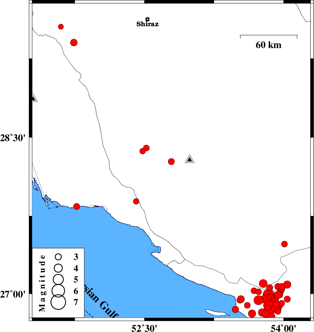 | 2010/07/24 | 13:07:38.1 | 17:37:38.1 | 26.85 | 53.48 | 14 | ML3.2 | Persian Gulf, 62 km South-East of Lamerd | ||