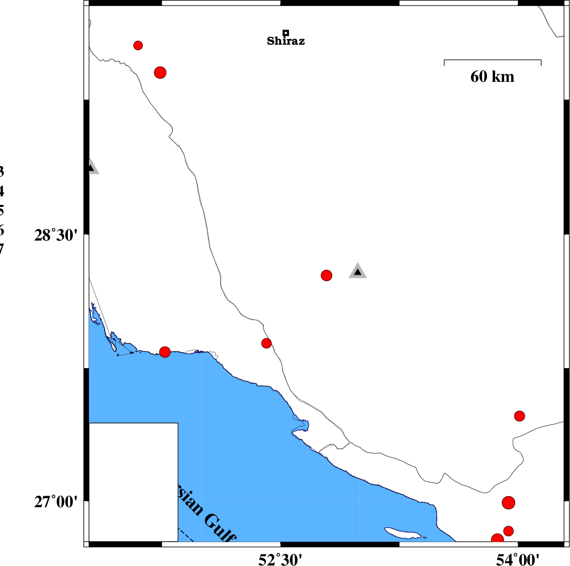 | 2010/08/04 | 07:45:07.9 | 12:15:07.9 | 27.48 | 54.01 | 14 | ML3 | Fars Province, 39 km South-West of Lar |