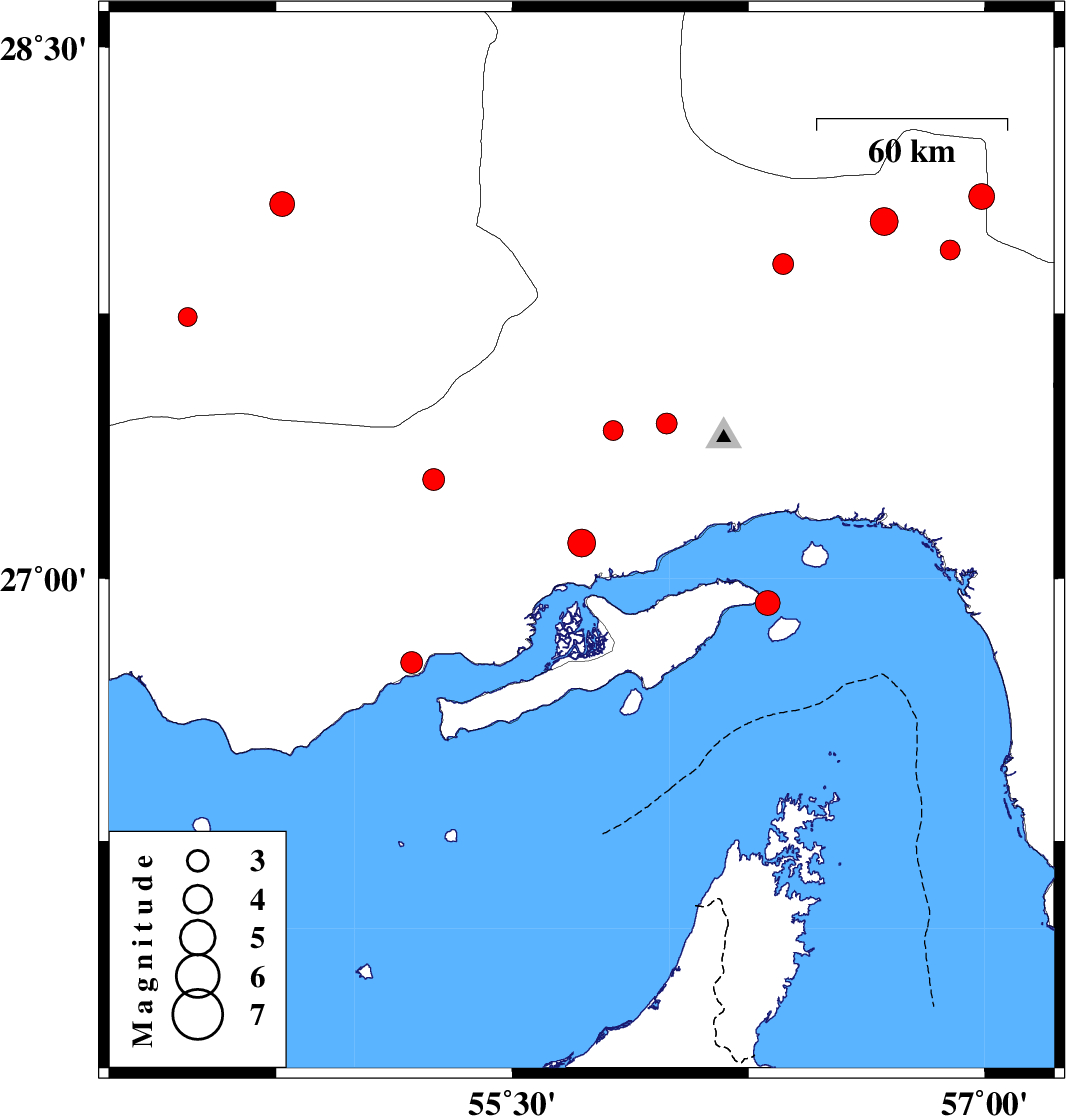| 2010/07/14 | 14:12:49.4 | 18:42:49.4 | 26.93 | 56.31 | 8 | ML3.5 | Persian Gulf, 5 km Qeshm |
