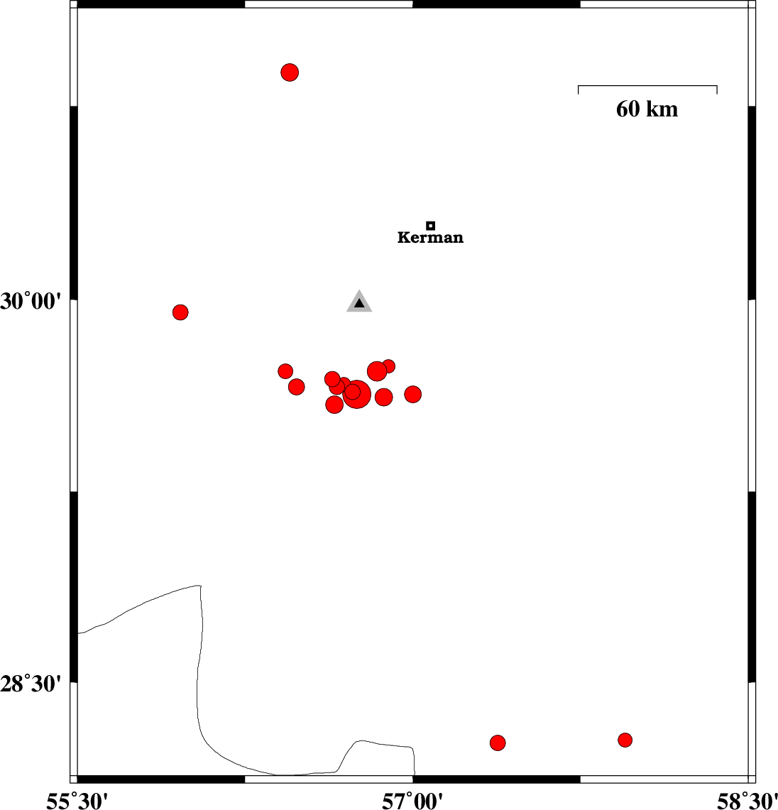 | 2010/08/11 | 14:09:47.5 | 18:39:47.5 | 29.63 | 57 | 5 | ML3.4 | Kerman Province, 53 km South-East of Bardsir | ||