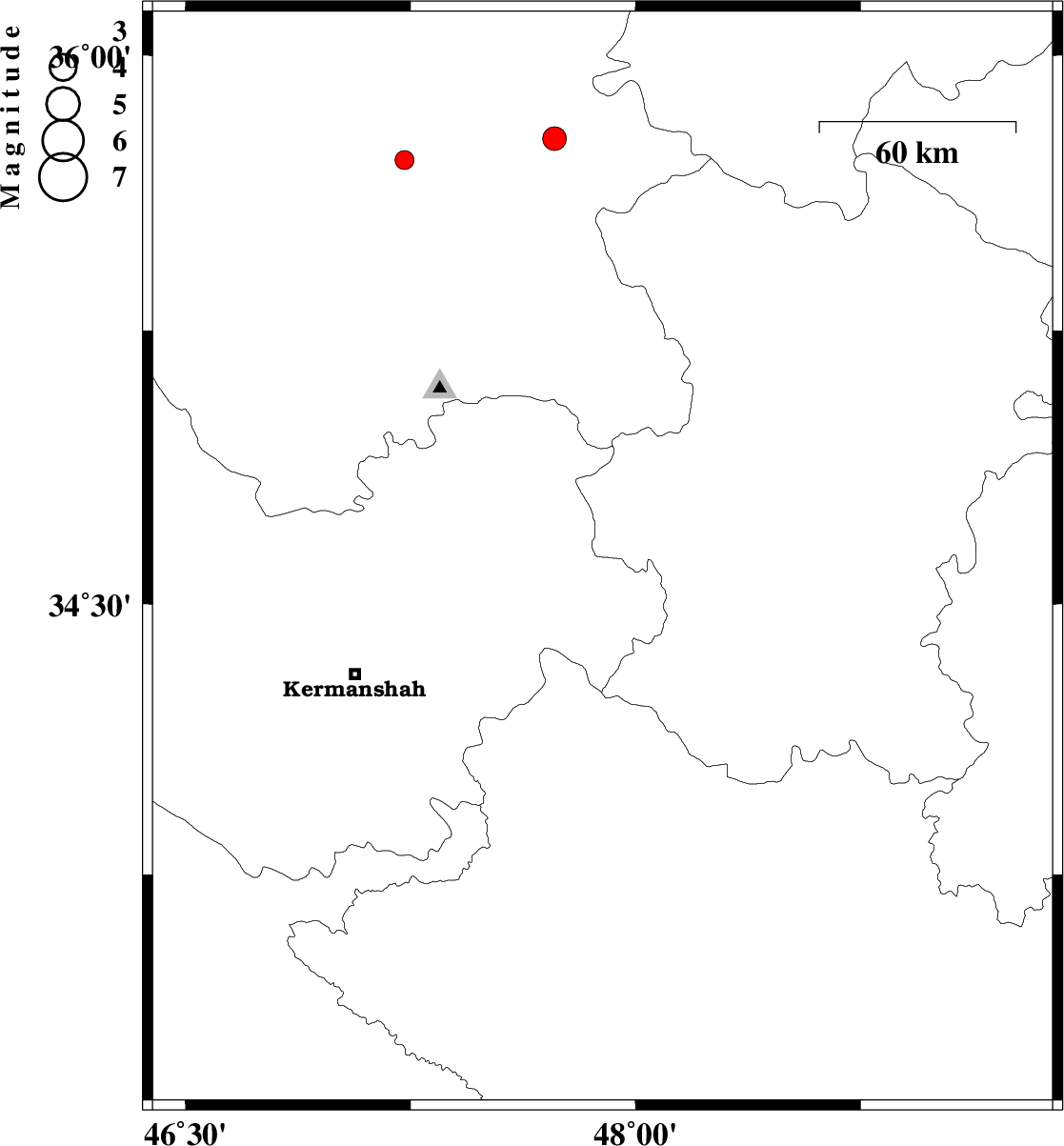 | 2010/08/13 | 22:48:37.0 | 03:18:37.0 | 34.62 | 47.89 | 14 | ML2.9 | Kermanshah Province, 15 km North of Kangavar | ||